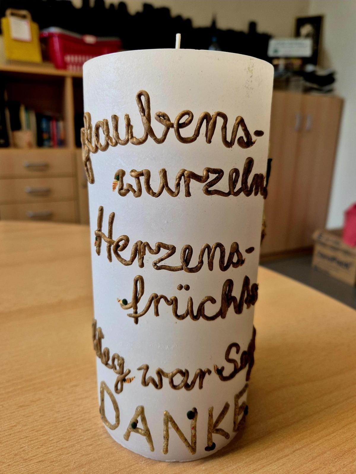 Die Verabschiedung im Erntedankgottesdienst war ein bewegender Moment. Kolleginnen und Kollegen, Schülerinnen und Schüler, Eltern und Wegbegleiter blickten gemeinsam zurück auf eine Zeit voller Segen. Es wurde deutlich: Christine Aechtner-Lörzer hat unsere Schule nicht nur mit aufgebaut, sondern mit ihrem Glauben, ihrer Haltung und ihrem Engagement geprägt.